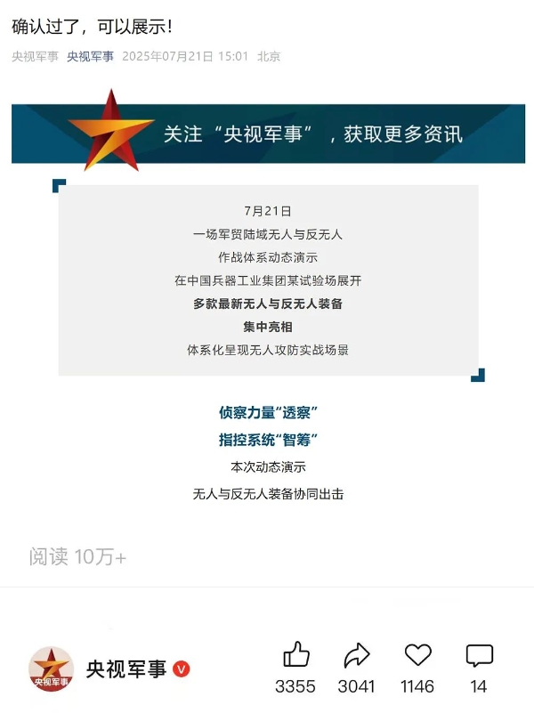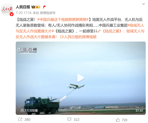 人民日報微博、央視軍事微博、央視新聞客戶端、中國新聞網、中新社國是直通車抖音、環球網微博、環球時報(X平臺、英文版客戶端)、中國日報網、央視軍事報道微博、中國軍號微博、中央廣播電視總臺“空天逐夢”微信視頻號、共青團中央B站、國資小新微博等中央主流媒體、國家部委的新媒體播發集團公司陸域無人與反無人作戰大片等視頻作品。